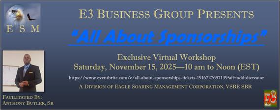 We invite you to register your fundraising team (which may be a team of one) for the most popular and impactful professional development workshops of E3 Business Group, a division of Eagle Soaring Management, a veteran-owned business, and gain valuable insights and techniques for the underutilized and misunderstood concept of sponsorship.